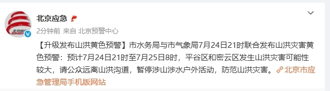 根据@beijing紧急微电导,北京市政水务局和市政气象局的消息,北京的消息在7月24日21:00加入了托伦特山脉的黄色警告:预计从21:00到7月24日至8月8:00,7月25日,托特伦斯·普林格(Torrents Pinggu)和Miyun地区的可能性很高。请远离山洪流,暂停涉及山脉和水的外部活动,并避免山河。编辑Xin Jing