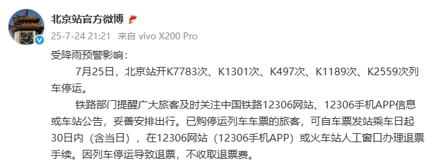 - 编辑:皇冠APP官方下载 -受雨水警告的影响,北京车站的五列火车于7月