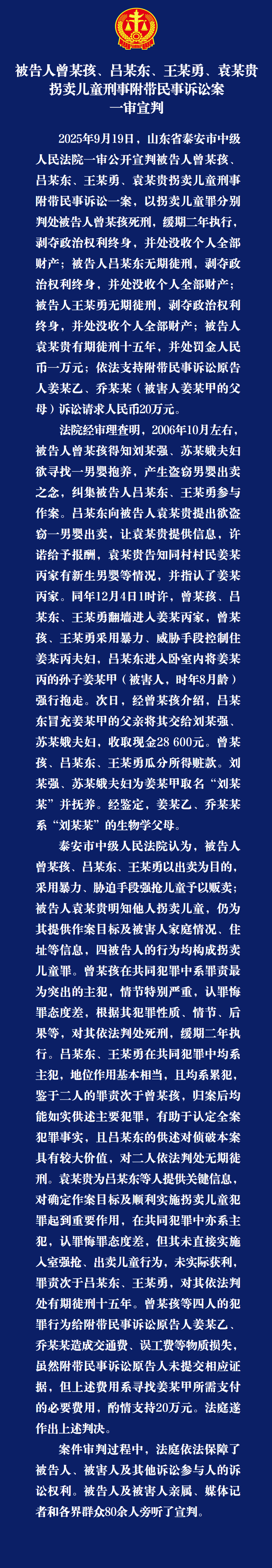 北京新闻根据微博的官方说明太极拳中级人民法院,9月19日,宣布了该判决的第一个例子,该判决是针对审判的刑事和民事案件宣布的,Zeng Mauhai,Lu Moudong,Wang Mouyong和Yuan Mouyui的犯罪和民事诉讼和贩运儿童的刑事诉讼。一个人被判处死刑,两人被判处无期徒刑,一名人被判入狱15年。据早期的报道,在2006年12月4日凌晨,8个月大的贾亚鲁·贾鲁(Jianu Jiaru)被从他的祖母的家中抢走,三名男子爬上墙并绑架。 2024年1月,爬上墙以捡起孩子的买家Zeng和Lu分别被公共安全机器人逮捕。检察机构认为,Zeng Mou,Lu Mou和其他四个绑架了有暴力胁迫的儿童,因为其目的是背叛。他们的行为违反了刑法,刑事事实是明确的,证据是效率。他们应该对贩运犯罪负责。详细信息>>>编辑Liu Jiani
