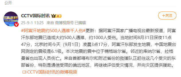根据《闭路电视国际时报》的报道,根据阿富汗官方媒体的最新报道,东阿富汗地震造成近500人丧生,大约1000人受伤。在8月31日,当地时间的11:47北京时间(9月1日)的当地时间,在东阿富汗发生了地震。中国地震网络测得的幅度为6.1级。这次地震的中心位于纳加哈尔省。库纳尔和拉格曼省附近也遭受了伤亡。来自首都喀布尔和附近省份的救援团队急忙进入东部省份,尤其是沟通有限的僻静地区,将继续评估灾难情况并为受灾的地区提供援助。编辑Mao Tianyu
